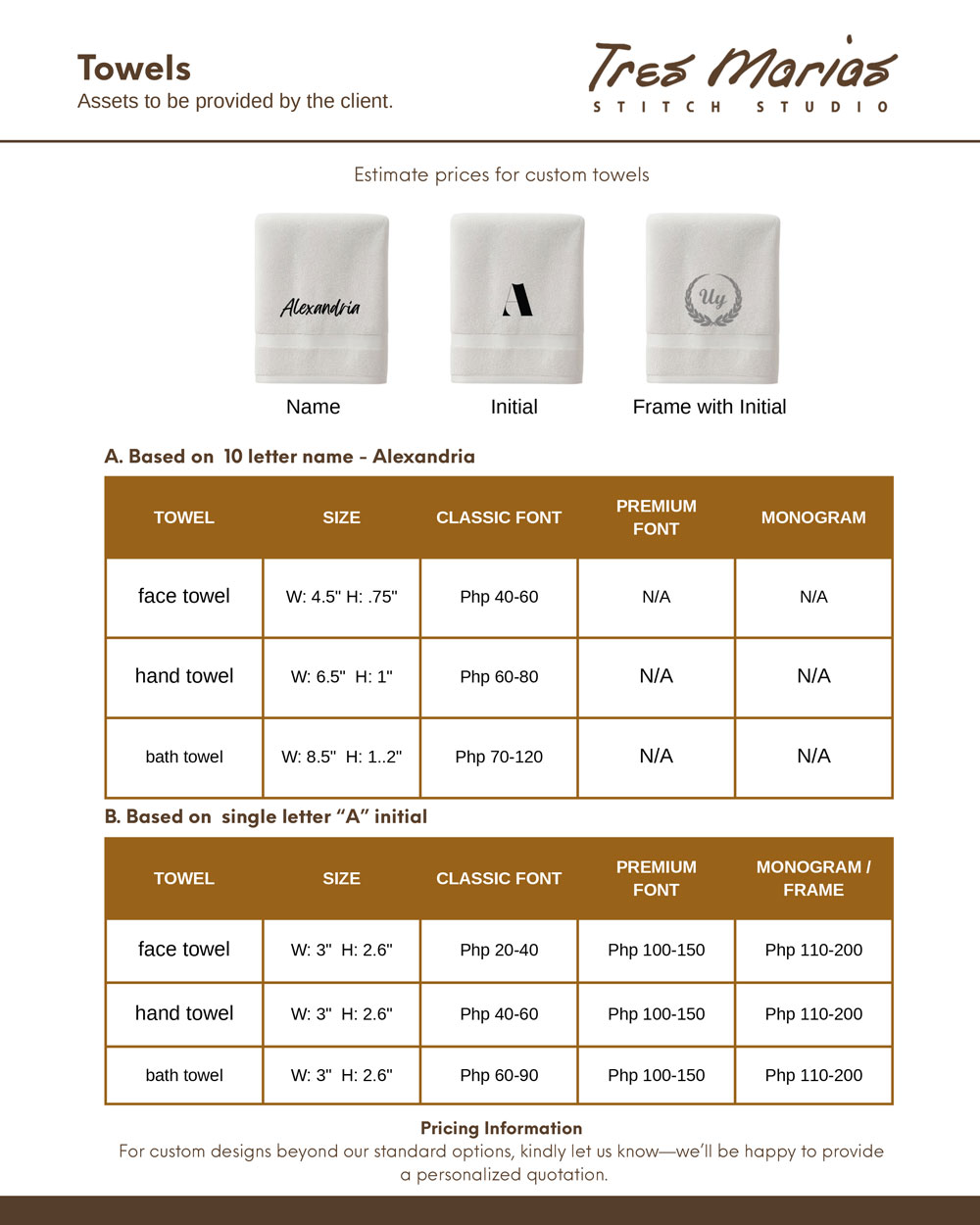 Should you wish for Tres Marias to source towels for you, a minimum order of 20 pieces applies.